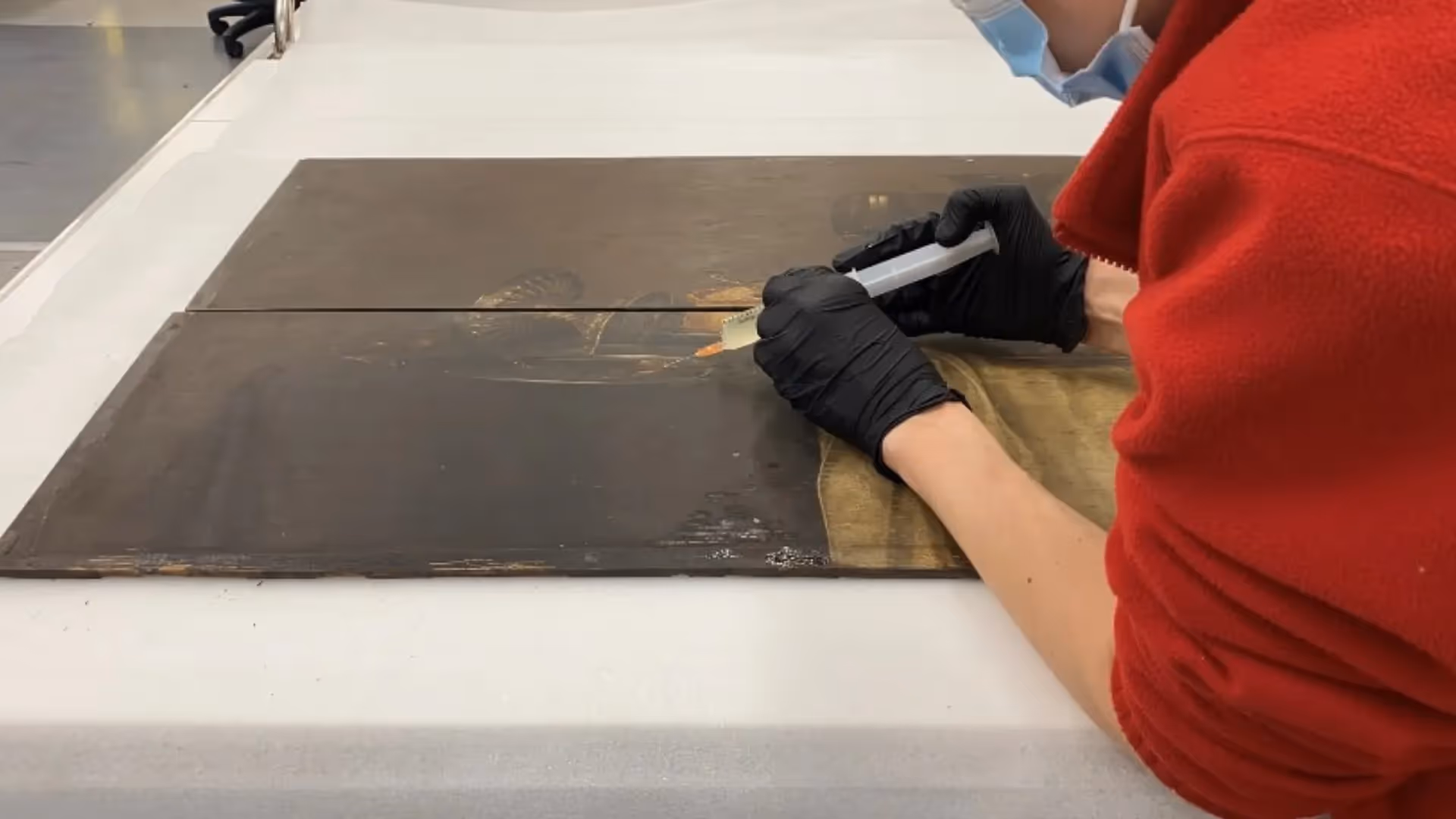 Once the panels were joined, Senior Paintings Conservator, Claire Heasman then completed her meticulous stabilisation of the paint layer. Then she filled the area of loss to the original surface depth and texture which allowed her to re-create the painted finish where lost, perfectly mimicking the style and technique of the Dutch Master himself in modern reversible pigments and resin.