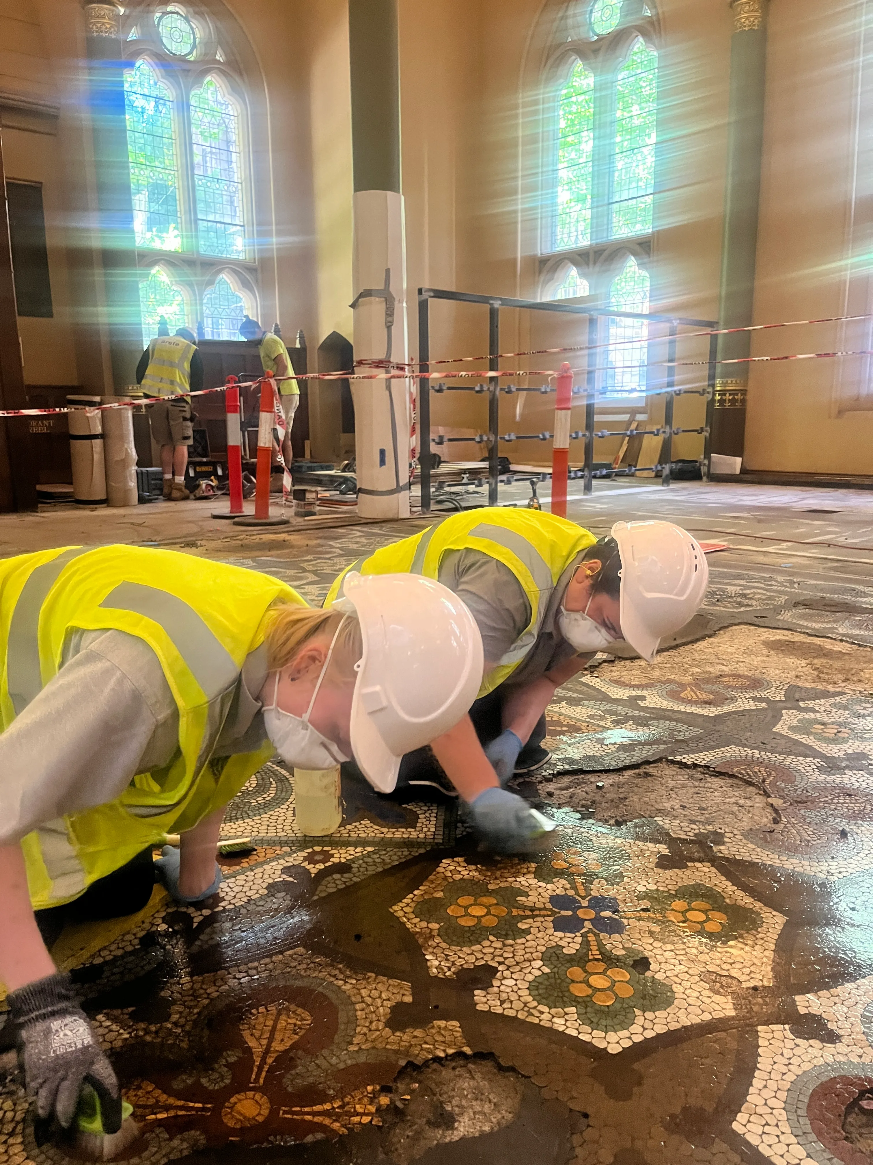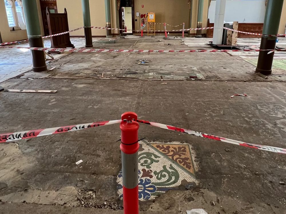 - Removal and disposal of compressed floor sheeting and adhesive to expose the whole mosaic prior to works. As work was about to commence, non-friable asbestos was identified in both materials, and the area needed to be isolated and monitored throughout the entire removal process.
