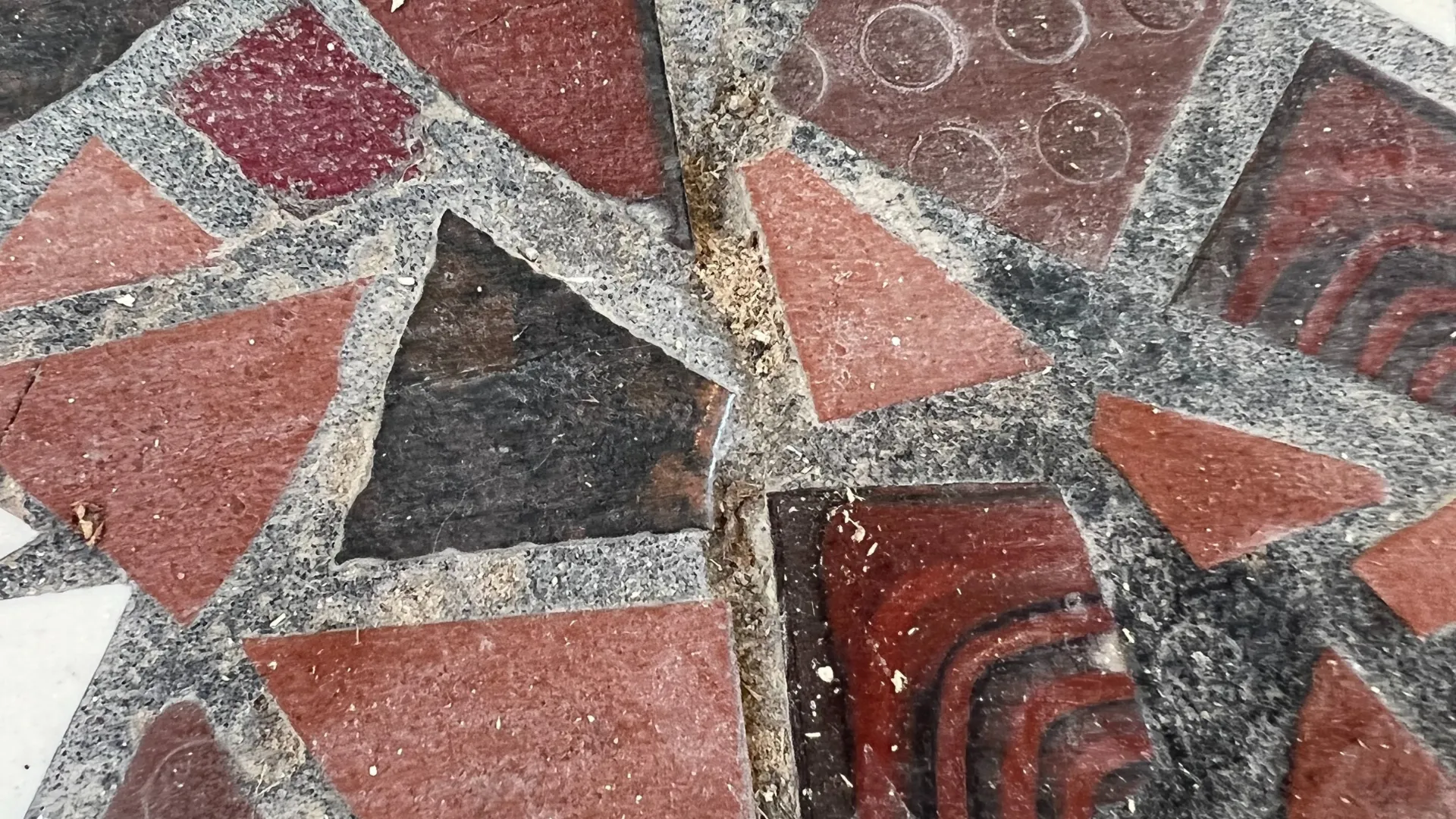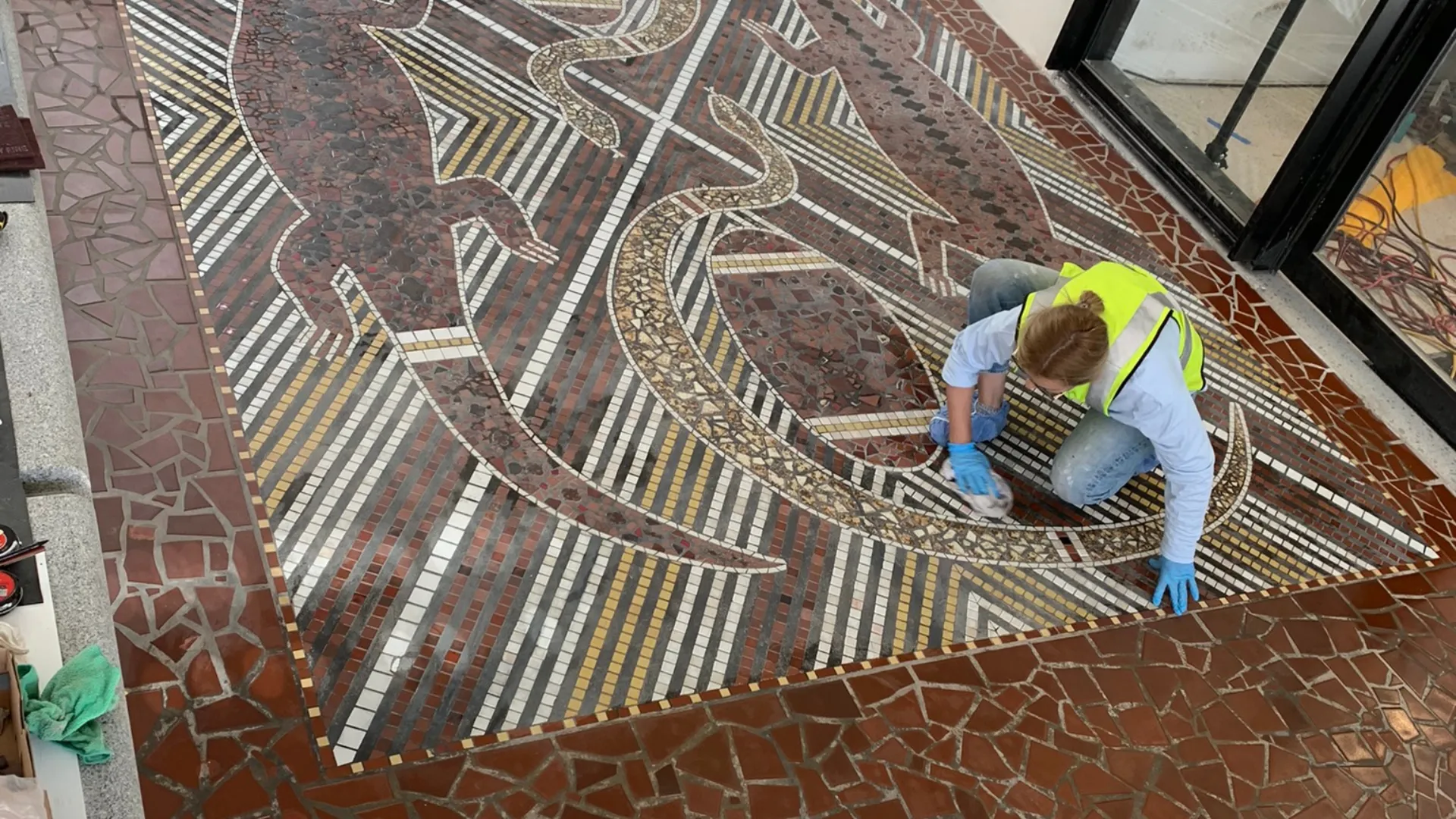ICS conservators assessed the mosaic and determined that overall, it was structurally sound, and was well-bonded in a cement substrate. There was some cracking of the slab and general abrasion due to wear and tear of the glazed tile surfaces in a pedestrian traffic area.