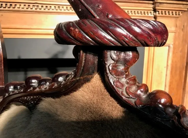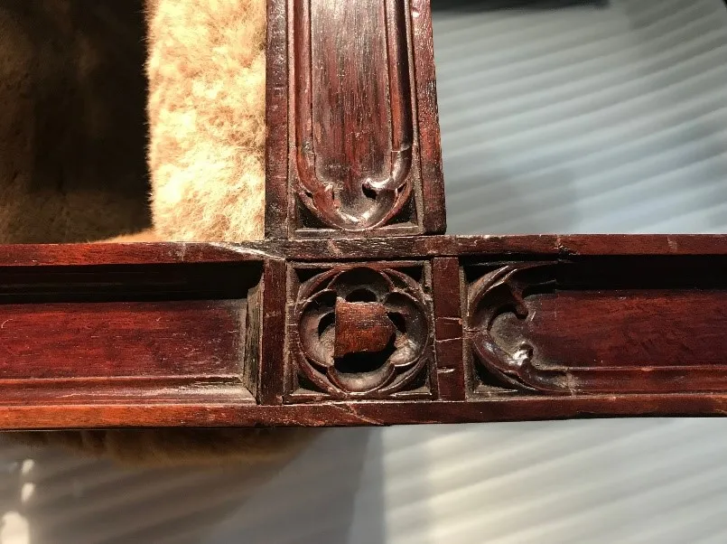 - Consolidation of the spires on the top of the back legs and front rail joints with animal glue.
