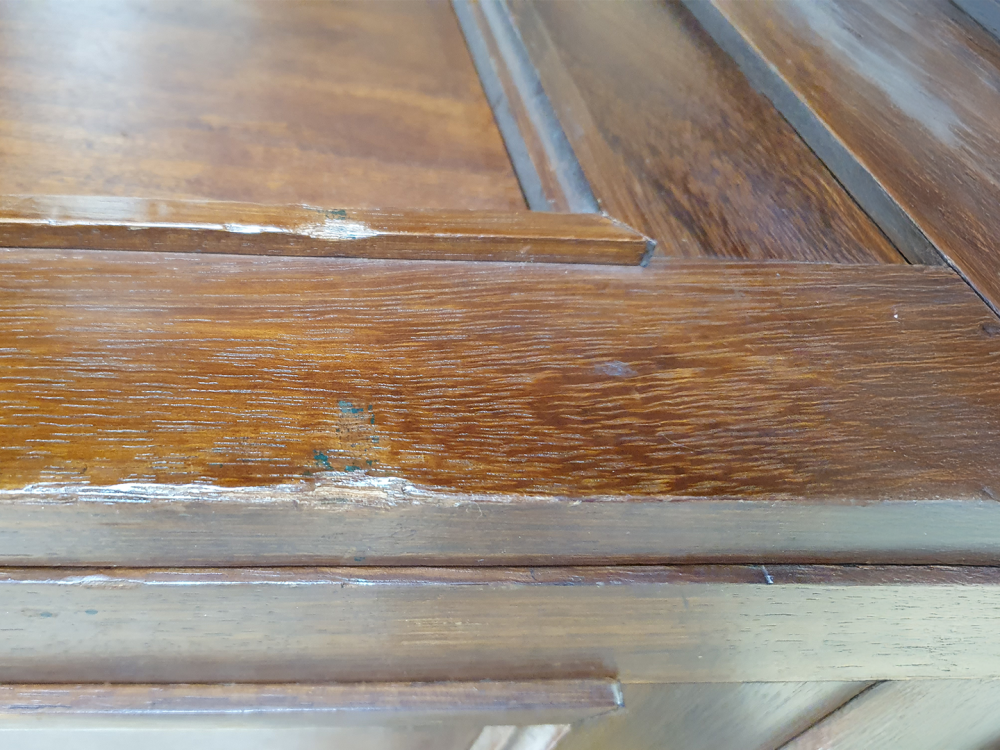 - The timber panelling and doors, along with door brassware and hardware, all required cleaning and re-waxing. Cases of timber damage and loss of coating tothe brass were also found.