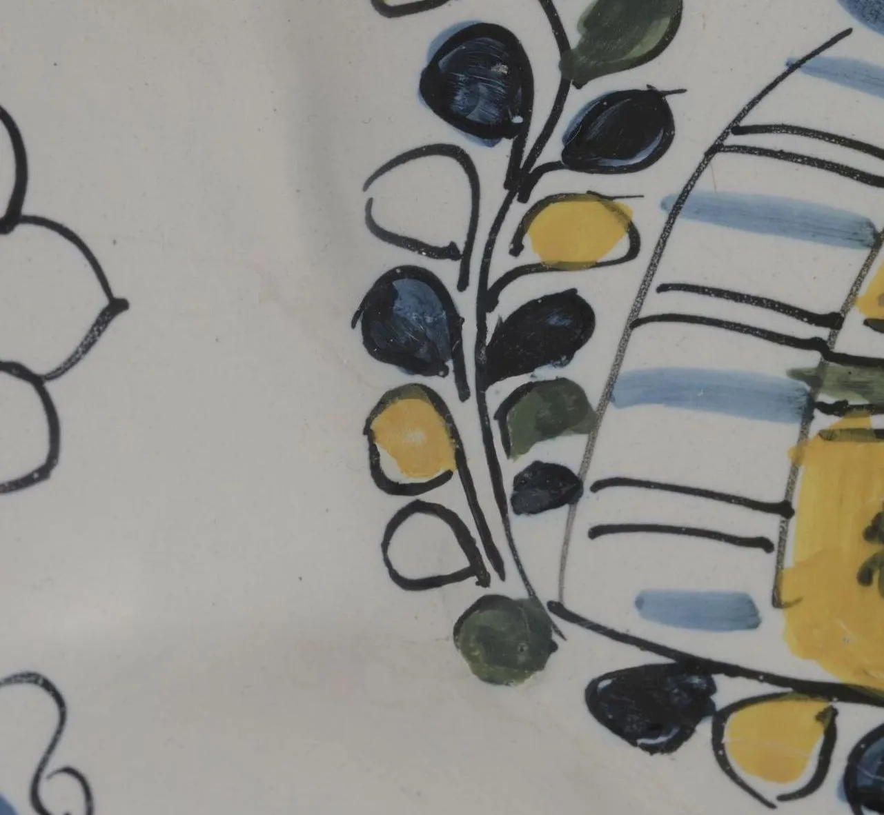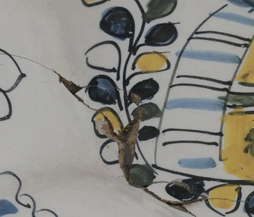 The plate had been broken in the past and repaired with an unknown adhesive. To support these repairs, the plate had been lined with a fabric, which had discoloured and darkened over time. Since then, many years of surface dirt had built up and become ingrained in the various cracks and crevices. There were also numerous areas of loss and some joins were found to be slightly misaligned or incorrectly placed.