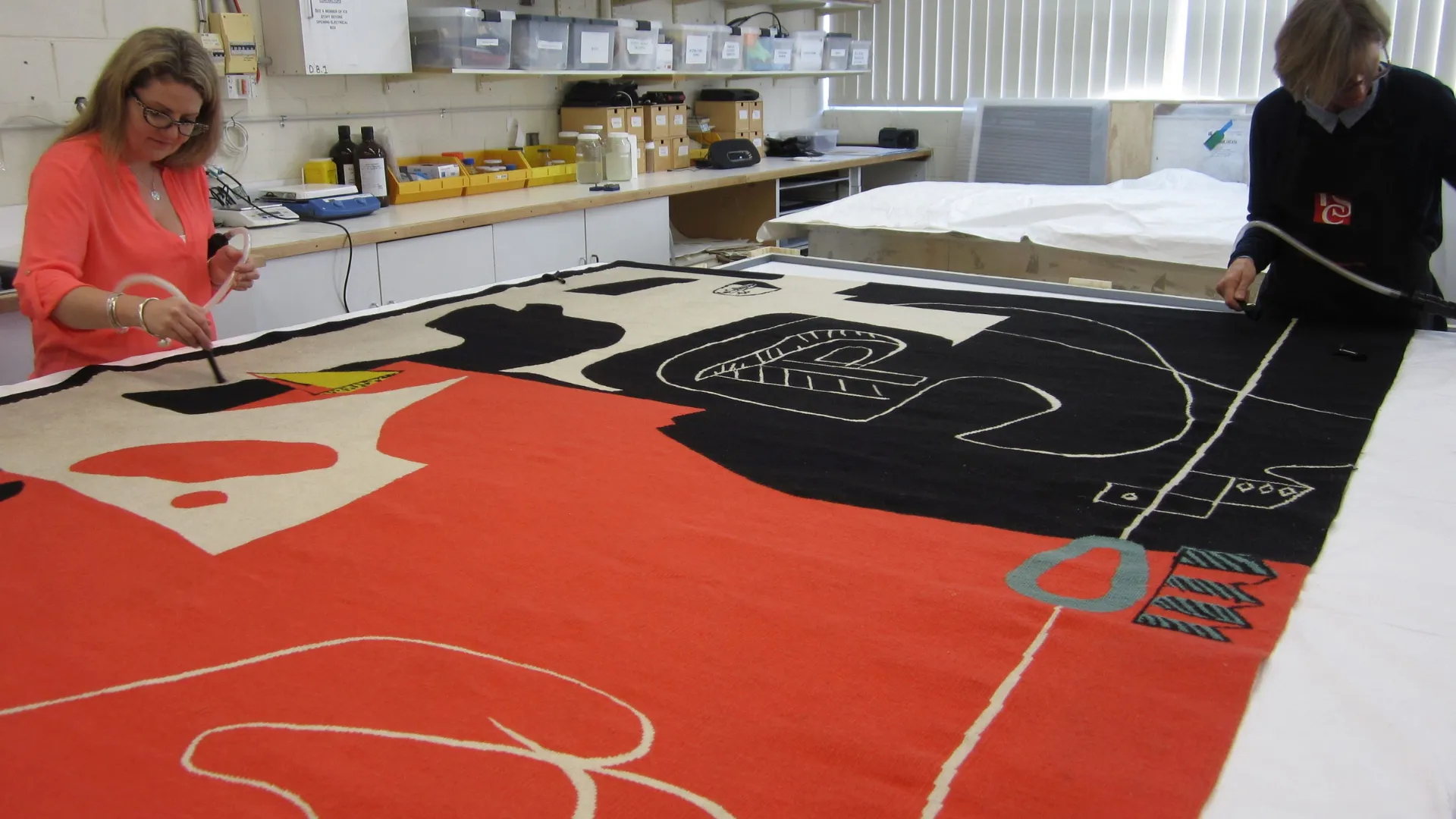 After initial surface cleaning, tests were carried out to ensure that the dye colours wouldn’t run when the piece was submerged in water. A custom-made tub was then built to enable the washing, and the detergent and water used had to be carefully selected and mixed to ensure the correct PH levels.