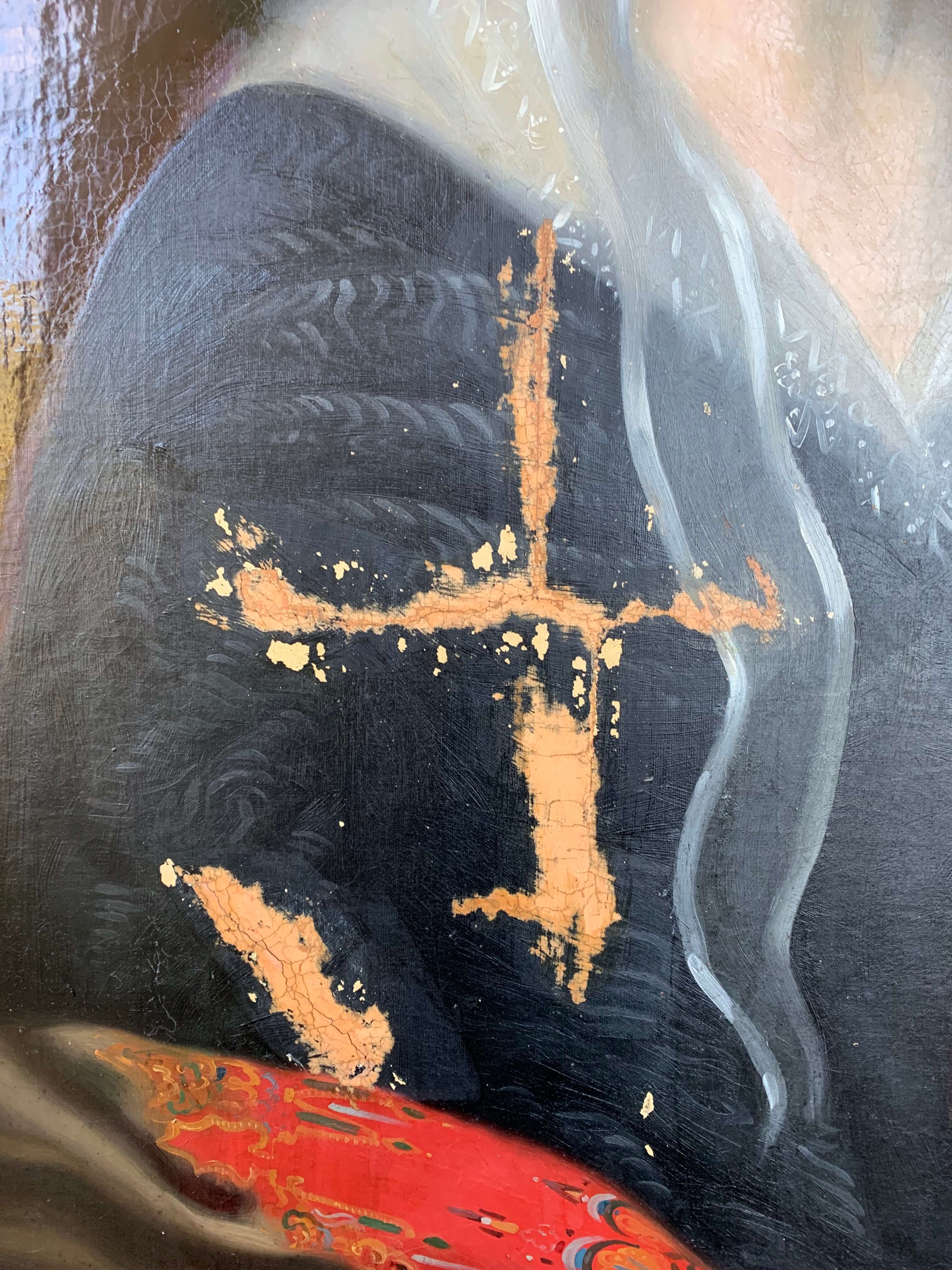 - Varnish and old overpaint layers were carefully removed, without causing damage to the original paint layers underneath. An isolating varnish was then applied to saturate out the original colours