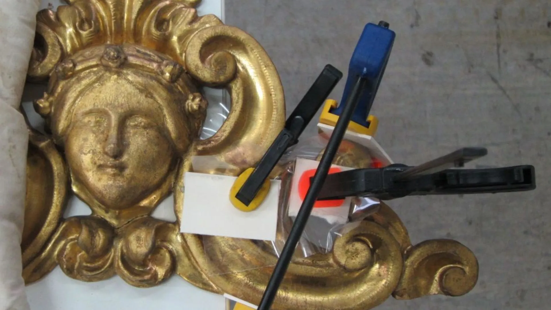 - Removing the gold overpaint on the frame to reveal the gilded surface underneath
