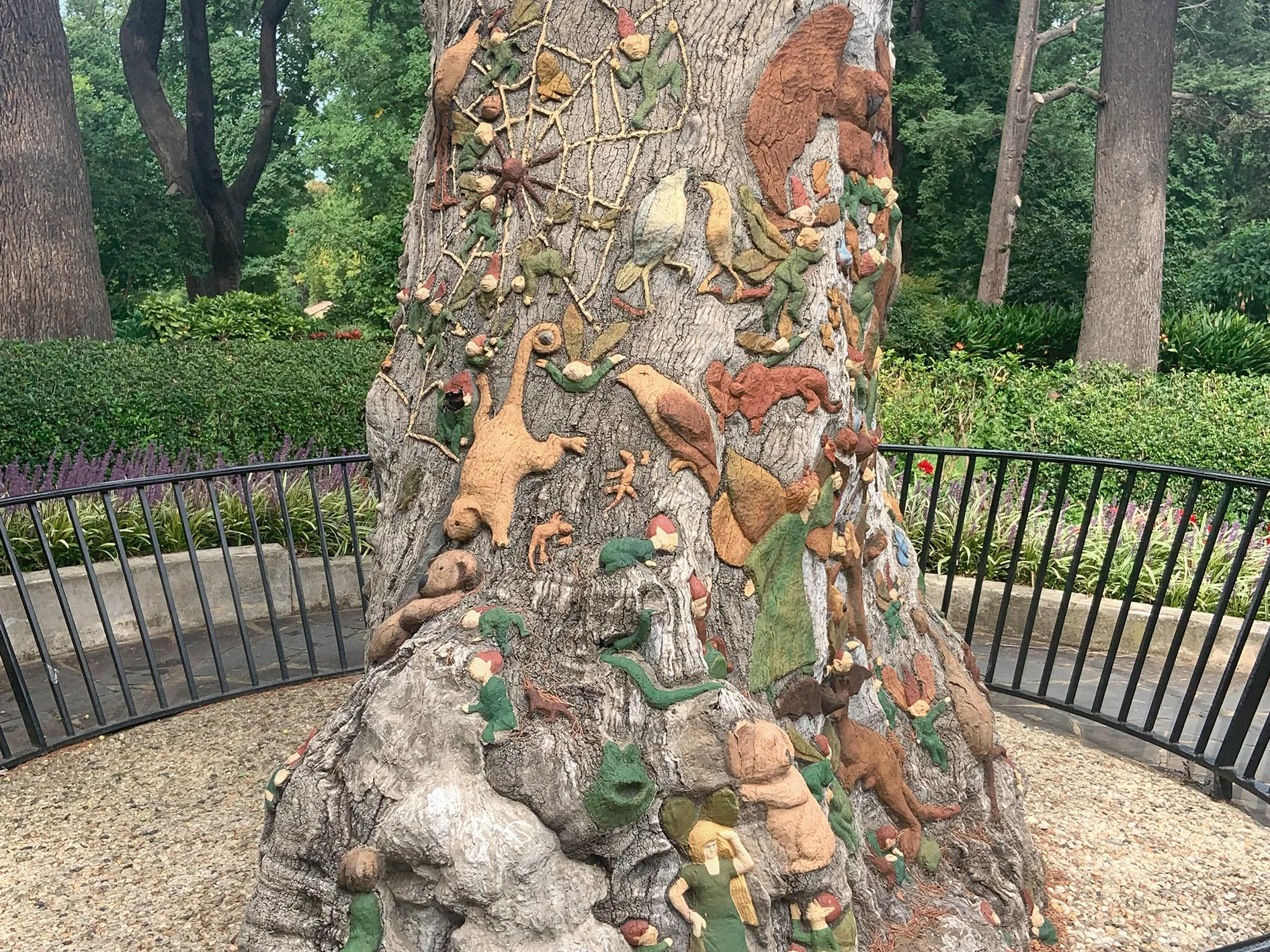 ICS has been monitoring the condition and conserving the Fairies Tree since 2012. Noted condition issues over the years include moss growth, accumulated leaf and pine needle litter, cracks in the tree and in the carvings, delamination of the cravings, loss of carved elements, weathering of the painted surfaces, pest infestations, graffiti, and wood rot.
